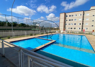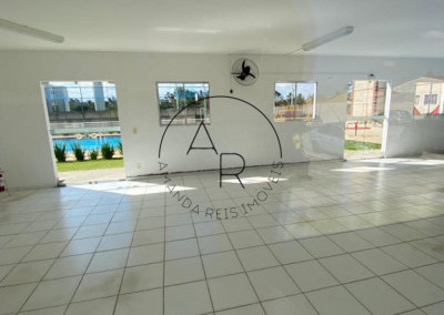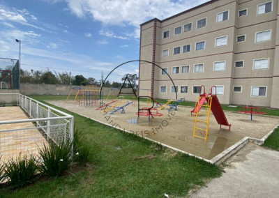 Área de lazer completa com piscina, salão de festas, quadra poliesportiva e parquinho infantil